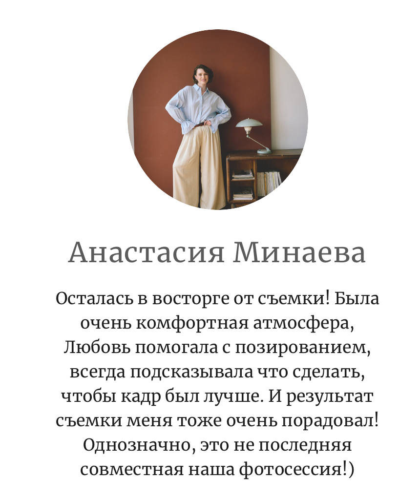 Меня зовут Любовь, я профессиональный фотограф из Москвы. Вместе мы создадим атмосферные кадры,